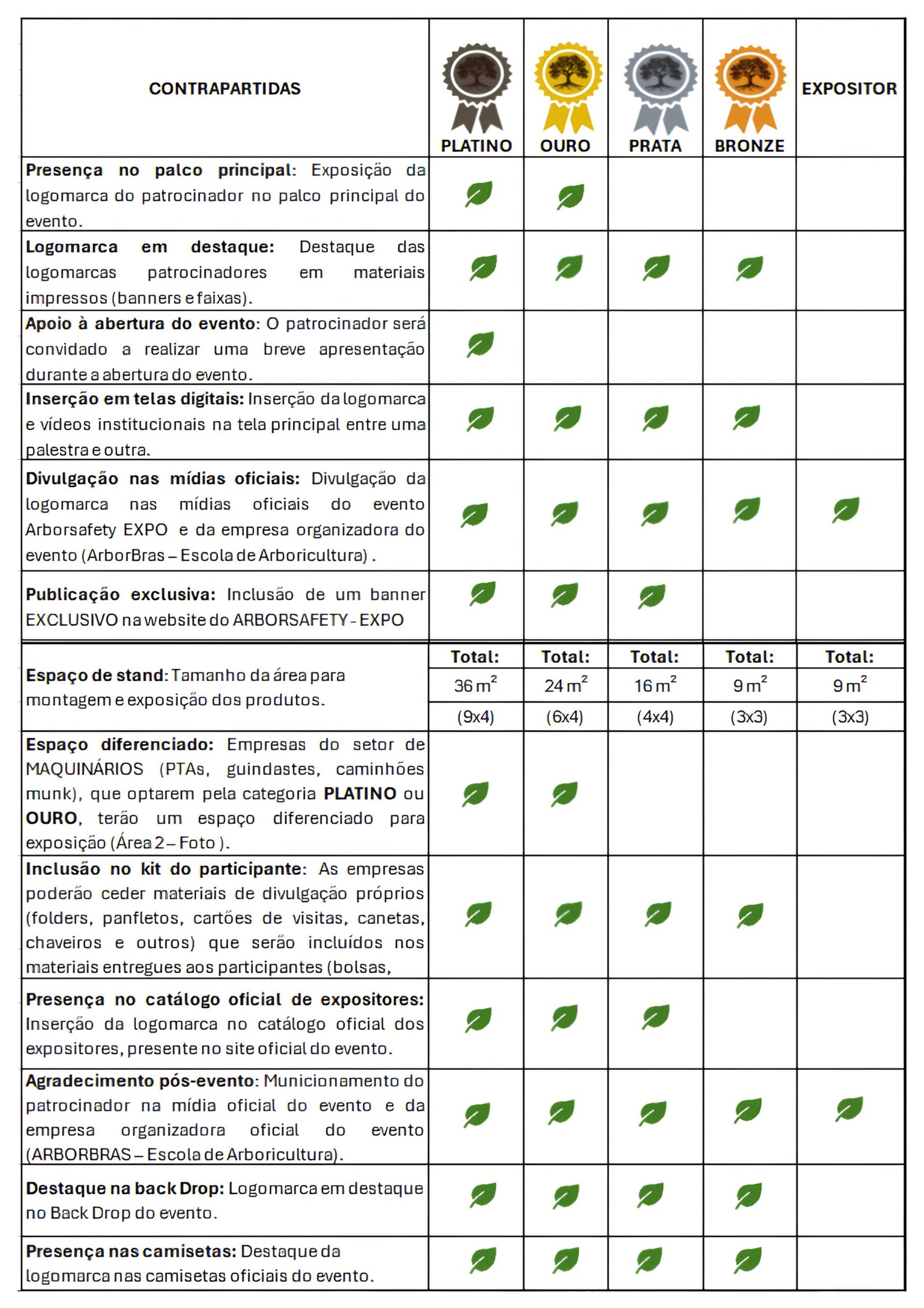 A organização do nosso evento tem como base os eventos de arboricultura que acontecem nos EUA e Europa, onde os patrocinadores e colaboradores do evento têm a liberdade de montar seus estandes da forma como acharem necessário para exposição de sua marca. O único requisito é respeitar o limite de espaço conforme a categoria adotada para o patrocínio.